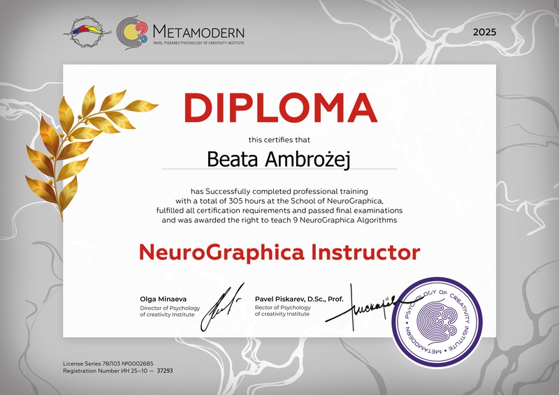 NeuroGrafika zajmuje w mojej drodze szczególne miejsce. Jest dla mnie językiem pracy ze stanem wewnętrznym, sposobem porządkowania emocji, myśli i napięć oraz narzędziem przywracającym poczucie sprawczości i wpływu na własne życie. To metoda, która stała się dla mnie przełomem – czego nie da się w pełni opisać słowami, a co najlepiej po prostu doświadczyć.